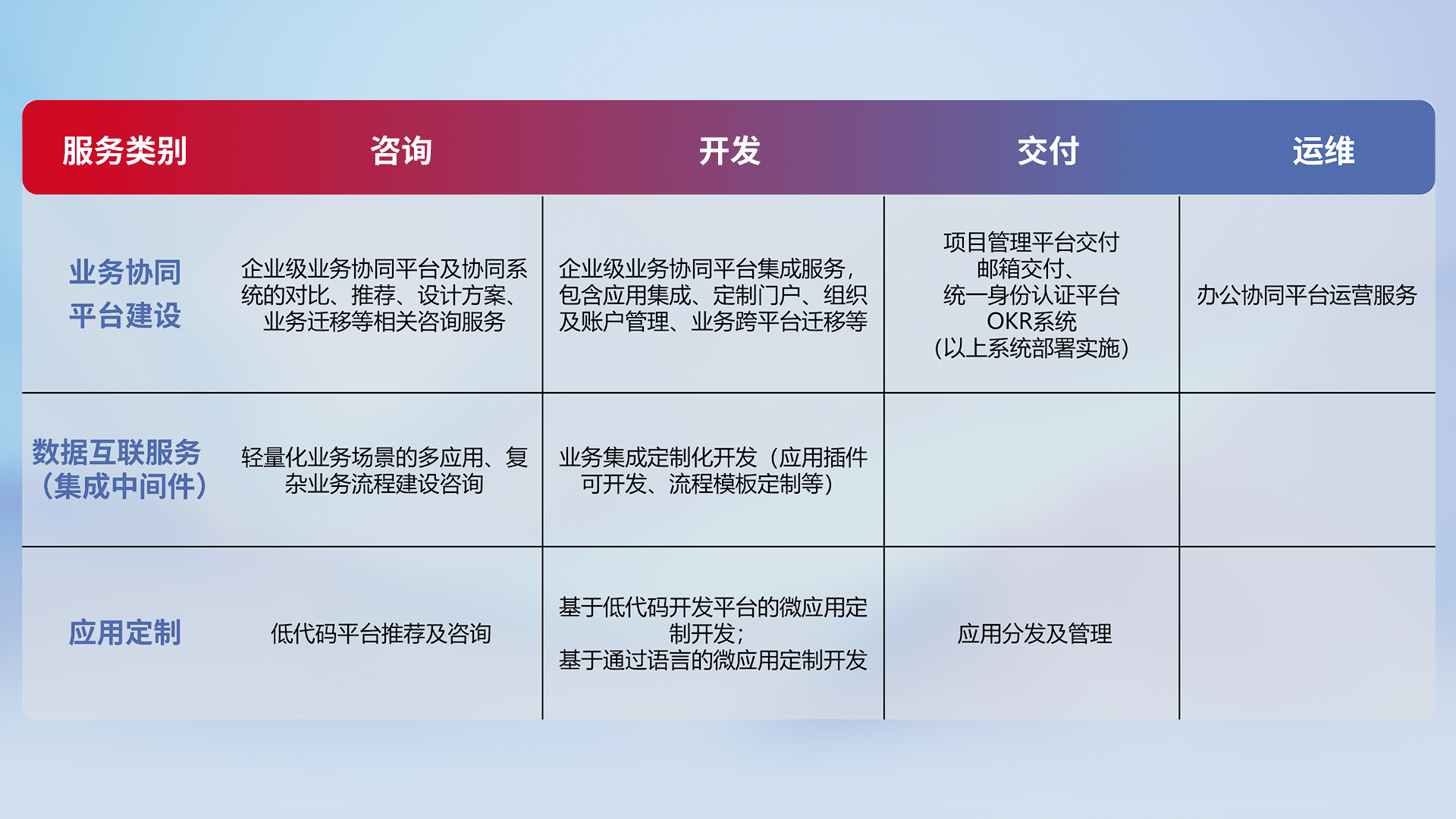 针对钉钉、、、、企微、、IDaas等平台级产品提供产品的规划、、、方案、、、交付、、定制化开发等服务,,,,实现如统一协同办公、、、、智能客户服务、、、、混合会议管理、、智能数据查询、、等业务场景,,实现数字化转型。。。
